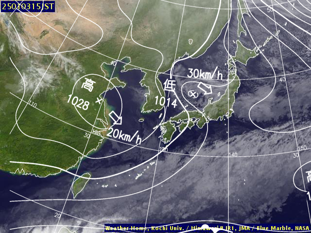 | 地上(高知大学気象情報頁赤外画像と気象庁速報天気図を合成) | |||
