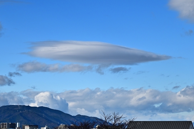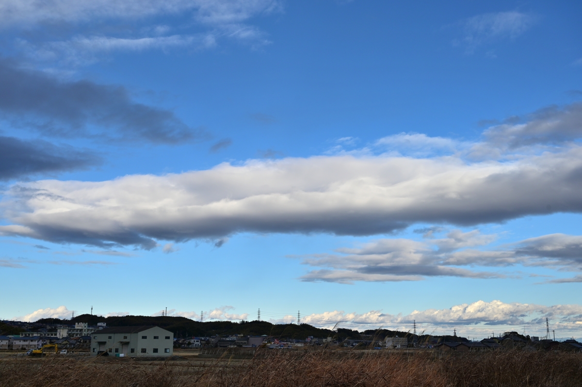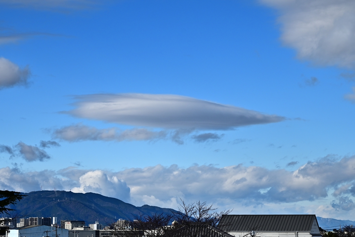 | 寒さは進み、最低/最高気温(桑名)は2.2/9.9℃。空は積雲が 流れつつ、ときおり降水雲があちらこちらに見られました。下層 〜中層にかけての卓越風が鈴鹿山脈や多度山系を越えることで 地形性の長い雲や、形の美しいレンズ雲を生んでいました。 |
