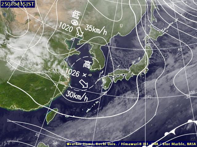 | 地上(高知大学気象情報頁赤外画像と気象庁速報天気図を合成) | |||