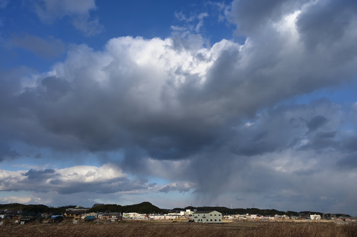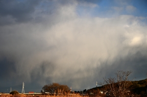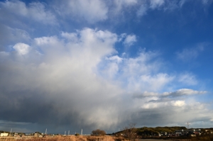 気圧の谷が通過して、強い西高東低の気圧配置となり、 西まわりに冷たい風が吹いて、寒気が流入してきました。 積雲や層積雲は迫力のある降水雲や尾流雲を伴うものが ほとんど。地上気温は8℃くらいあったので虹もあらわれる かどうか注目。虹が出てもおかしくない位置に陽が射したりも しましたが、結局、虹は無し。地上は日射で温まっていても 流入寒気で数百mの高度の降水雲は雨でなく雪のようでした。 |