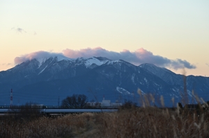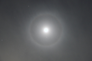 | 天気図で西高東低の等圧線の間隔が広くなり、冬の季節風も緩やかに なりました。透明度の高い青空が広がり、積雲とつるし雲がぽつりぽつ りと散在する空です。桑名での日没時刻は17時02分になり、そのころに は積雲もほとんど消えました。そして東の空には地球影が明瞭に見えて きた上に月(月齢11.4)が煌々と輝き始めました。サイモン&ガーファン クルの「アメリカ」の歌詞の一節がふと思い浮かびました。 そして15時の衛星赤外画像でその存在が気になっていた、九州に差し 掛かった上層雲域ですが、22時30分頃に全天を覆う巻層雲としてやっ てきました。全周かけることのない月のハロ! 月はほぼ天頂にあって ハロの輪の中には明るい木星を擁し、オリオン座などの冬の星座も見え ています。その後は、高層雲が空を覆い、ハロは薄れていきました |
