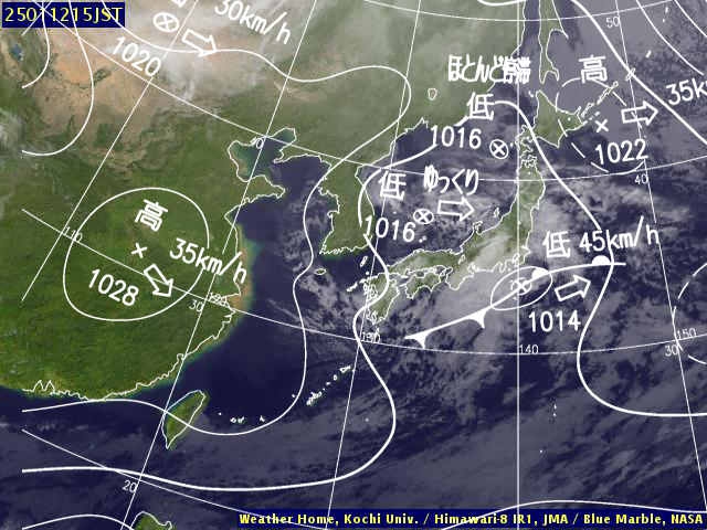 | 地上(高知大学気象情報頁赤外画像と気象庁速報天気図を合成) | |||