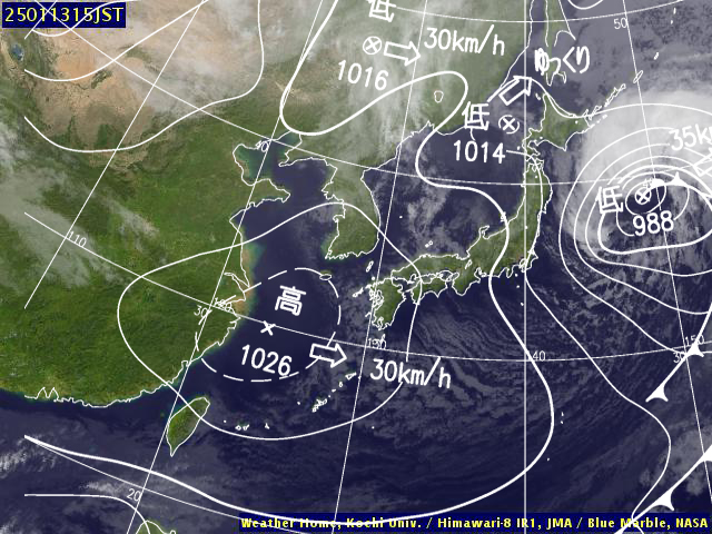 | 地上(高知大学気象情報頁赤外画像と気象庁速報天気図を合成) | |||