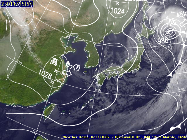 | 地上(高知大学気象情報頁赤外画像と気象庁速報天気図を合成) | |||