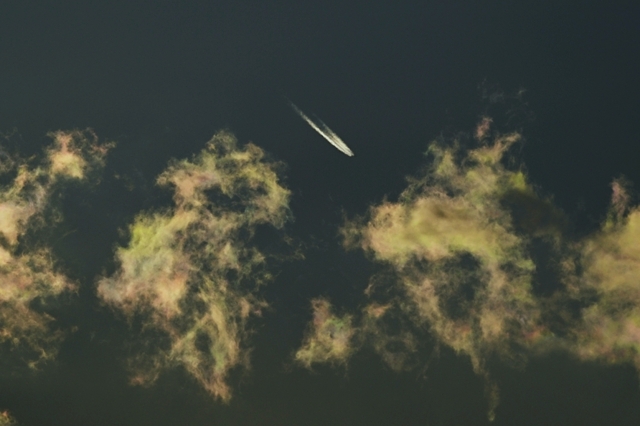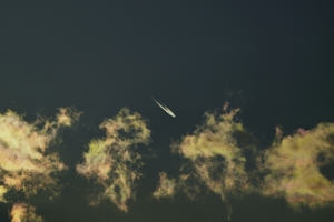 | 積雲の彩雲と短い飛行機雲 16:28 西南西 560mm |
