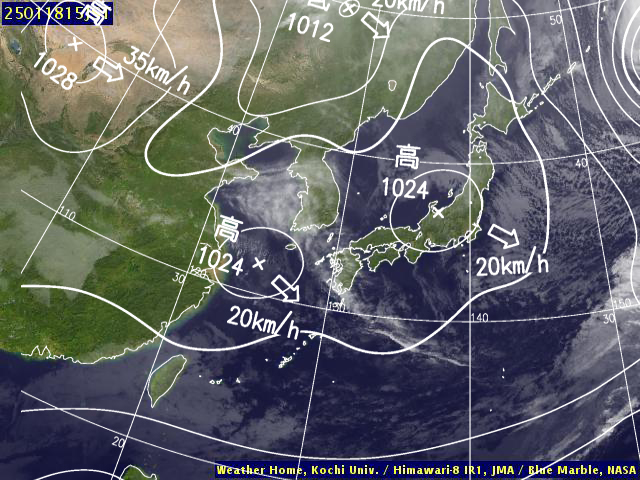 | 地上(高知大学気象情報頁赤外画像と気象庁速報天気図を合成) | |||
