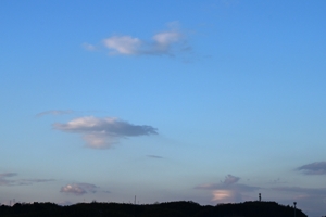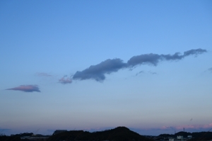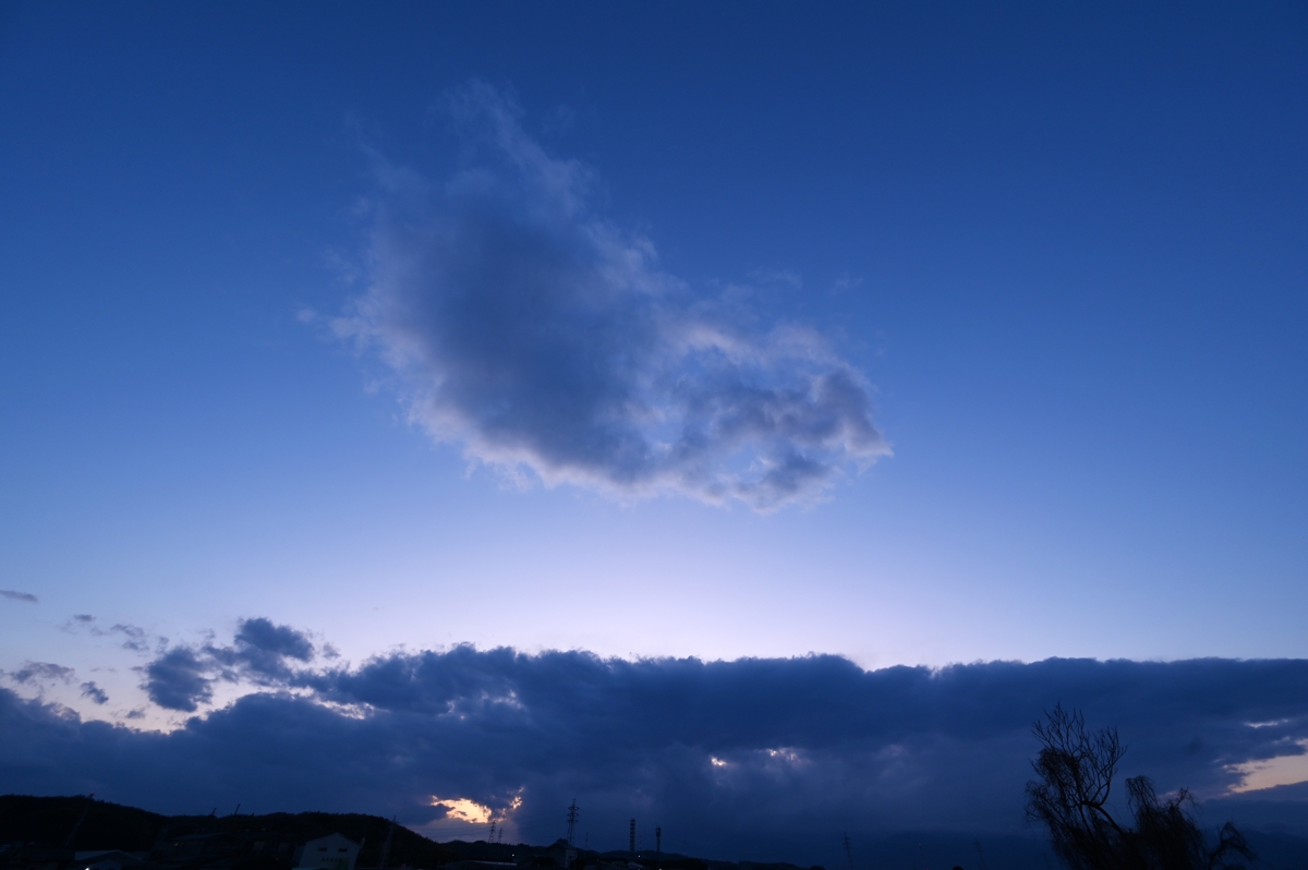 | 昨夜の夜半ころに降り出した雨は明け方まで継続しました。 昼前までは雨上がりの空の様相で、高積雲や層積雲が残り ましたが、午後には快晴になり、夕方はそこに小さなレンズ雲が たくさん発生しました。そして、日没後の暗くなった空には西から 湧き上がるようにつるし雲が生まれ(上写真1番目)、やがて天頂 近くにまで広がりました(上写真2番目)。夕焼けの赤みをわずかに 残したブルーモーメントの壮観な空を魚眼レンズで撮影しました。 |