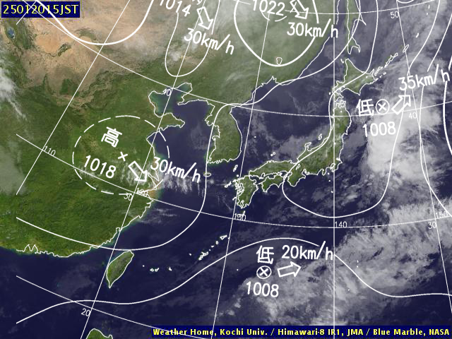 | 地上(高知大学気象情報頁赤外画像と気象庁速報天気図を合成) | |||