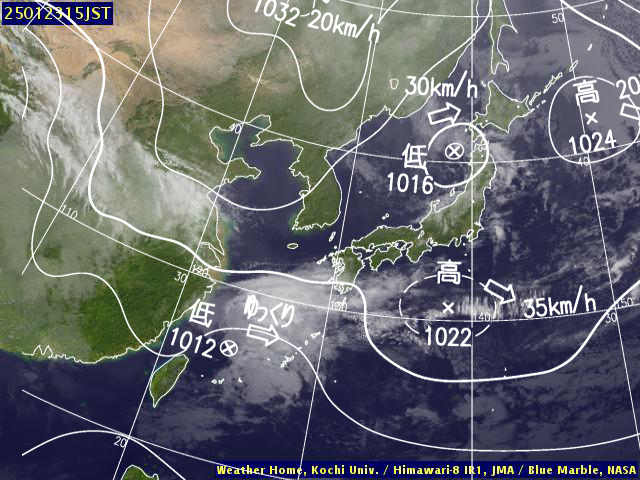 | 地上(高知大学気象情報頁赤外画像と気象庁速報天気図を合成) | |||