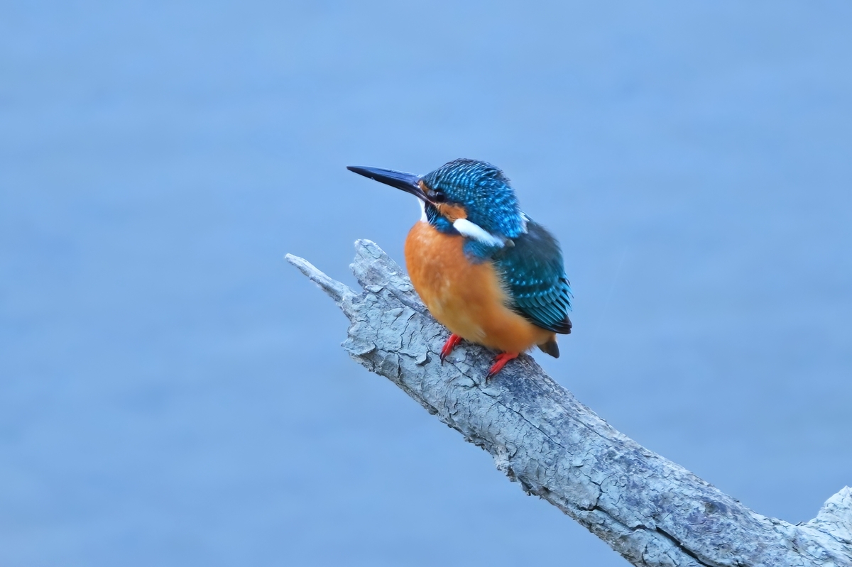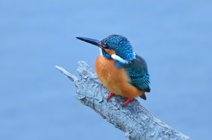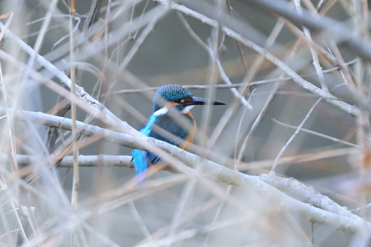 | 冷たい強風に雪が吹きつけてくる、夕方の員弁川にて。 ほとんどの野鳥は潜んでいるようす。カワセミも川岸の 樹木にじっと留まり続けること、約30分間。堤防の土手 の近くで多少は風が防げるようで、アオサギもそこに やってきてじっとしていました。カワセミはやがて飛び 去ったのち、風が弱まり雪が小やみになったころに、 倒木付近に戻ってきて、美しい姿を見せてくれました。 |