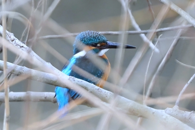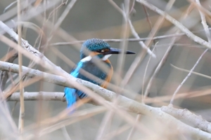 | カワセミ 16:08 川岸の樹木の下部で風を避ける。 顔の見える唯一のアングルで撮影。 |