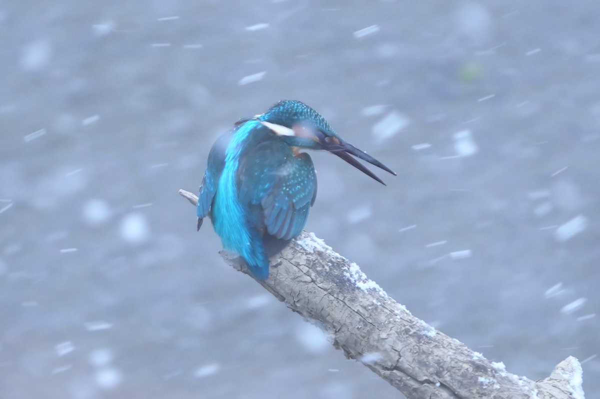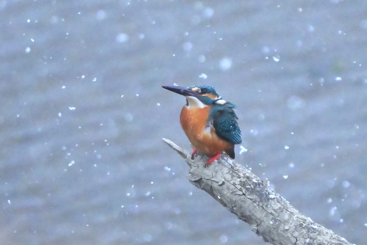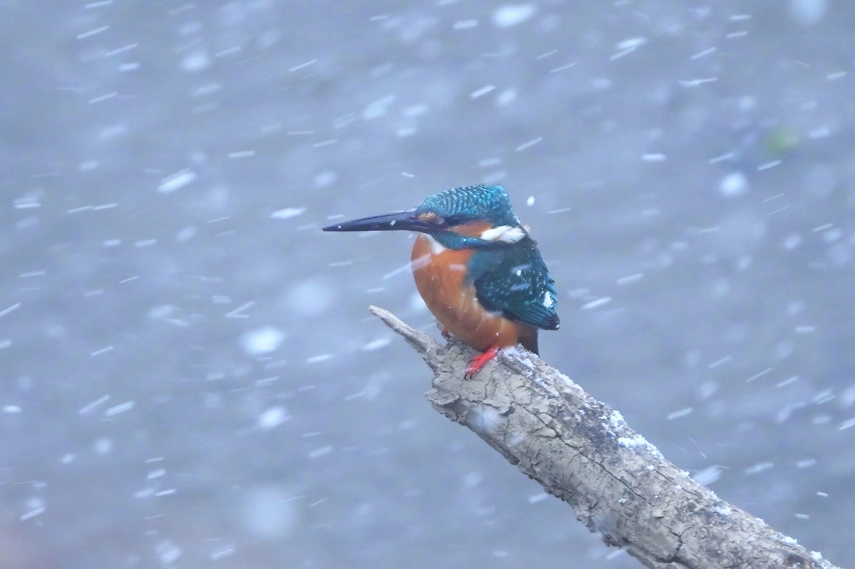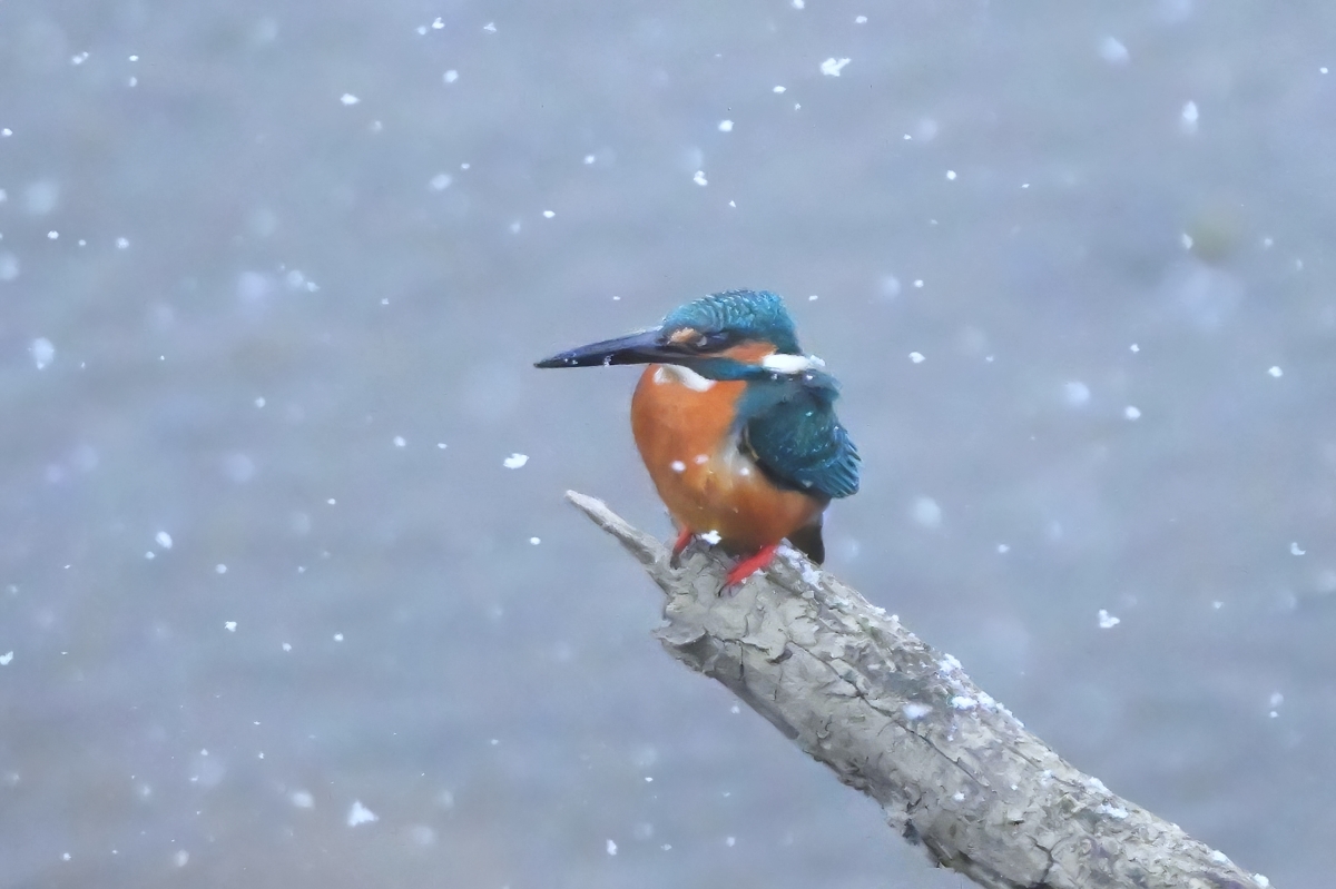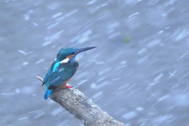強い寒気で西風吹く員弁川にて。 雪が舞う吹雪となって潜んでしまったかに 見えたカワセミが、猛吹雪の中にあらわれ しばらく川面の倒木に佇みました。 今日の吹雪の感じを表現できる シャッター速度は1/250あたり。 |