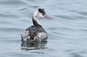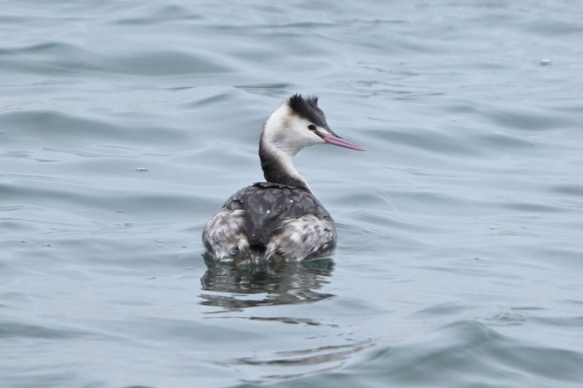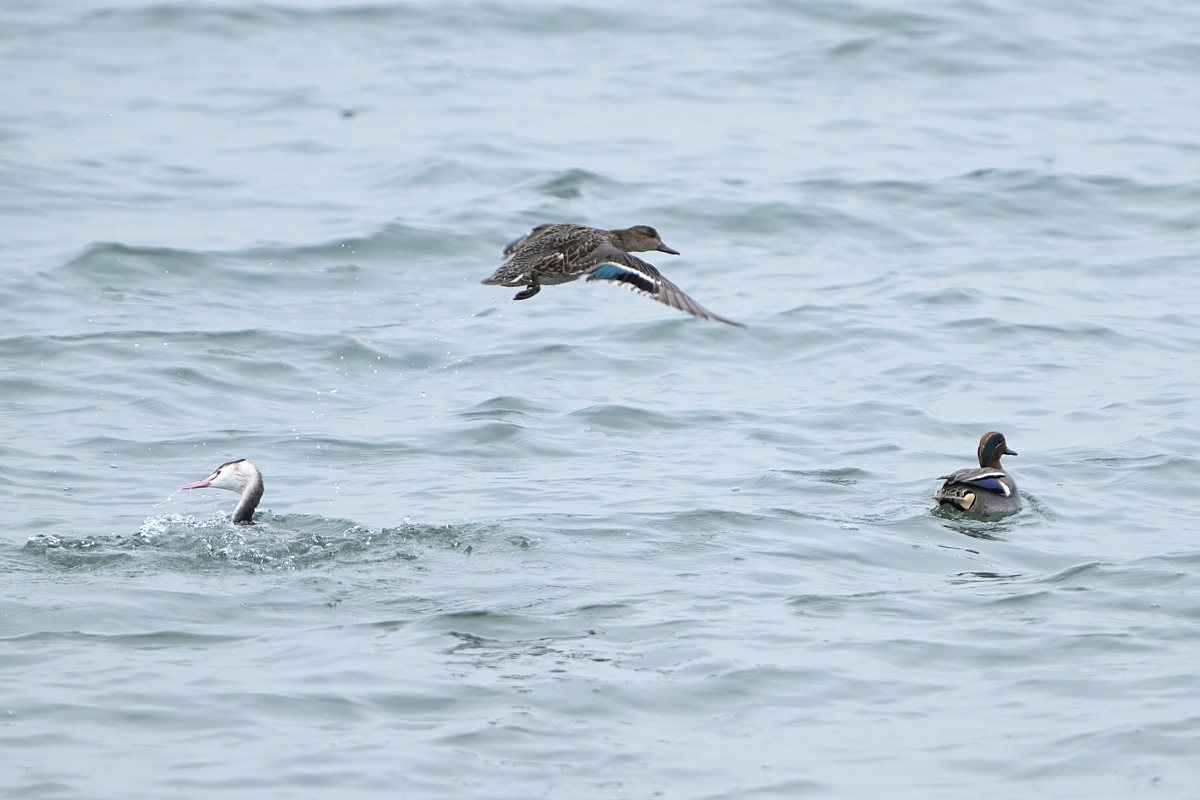 | カンムリカイツブリ | カンムリカイツブリの浮上に 驚くコガモ |