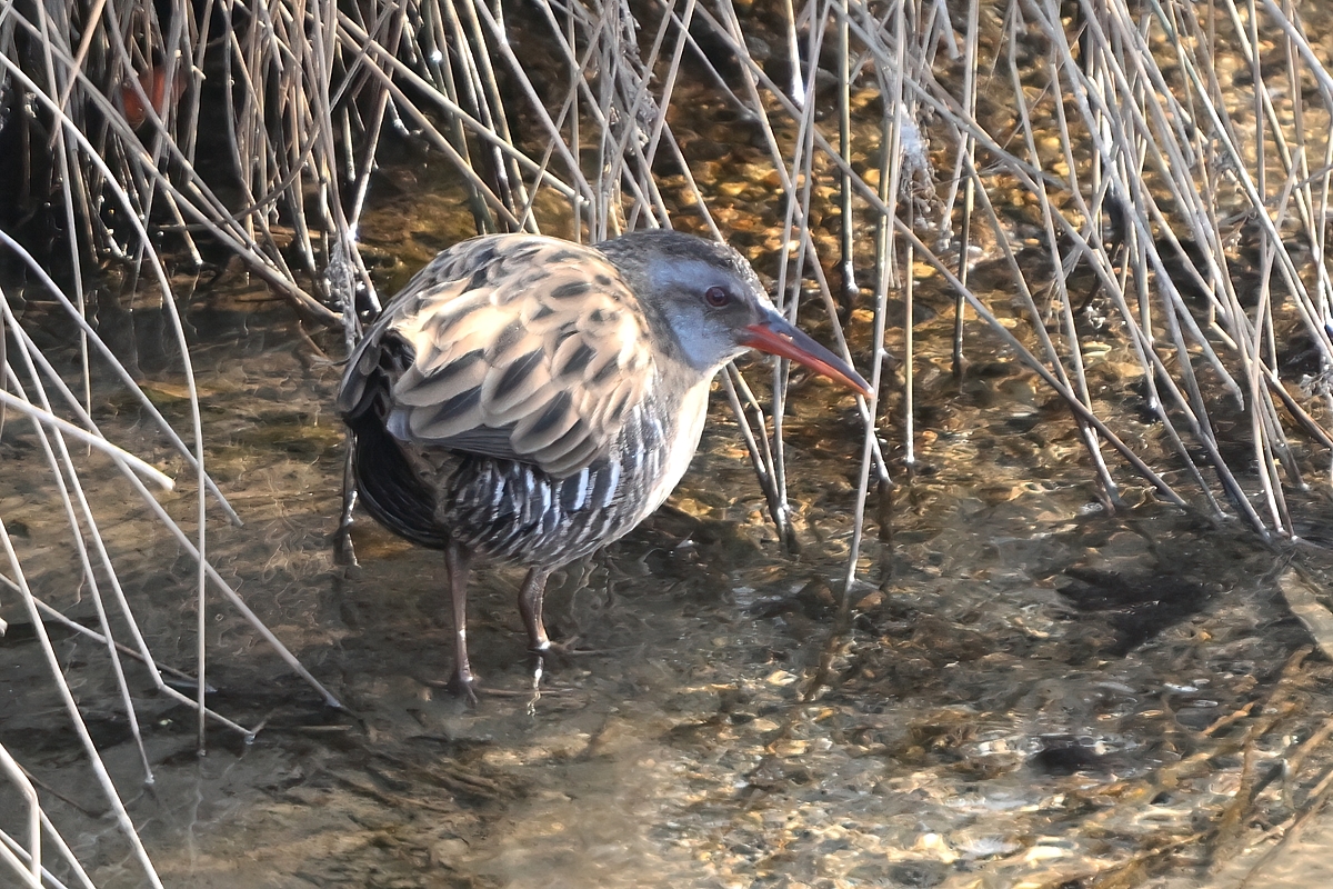 | よく晴れた空のもと、夕方の員弁川にて。 ヒクイナが長時間、歩き続けるなか、クイナも 同じ場所で歩き始めました。生息ポイントが 共通するだけでなく、一緒にいることがあるのも わかりました。さらには、ヒクイナが見えない場所 から浅瀬を越えるために飛ぶ姿も目撃! クイナもヒクイナも飛ぶのだ、と感動。 カワセミは日没のころに一度だけ登場。 今日もメスのほうだけでした。 |