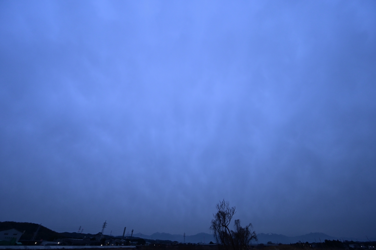 温帯低気圧が九州に接近。温暖前線の北東側に広がる バルジの雲域がかかってきました。昼過ぎから高層雲が 全天を覆うようになり、日没後には乱層雲に近い状態に なりました。夜のはじめころから明日昼前まで雨の予報。 |