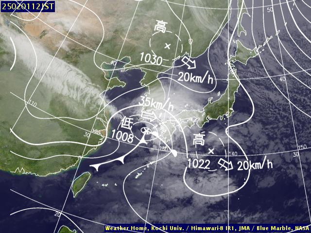 | 地上(高知大学気象情報頁赤外画像と気象庁速報天気図を合成) | |||