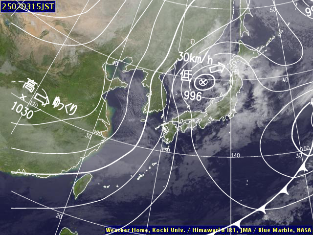 | 地上(高知大学気象情報頁赤外画像と気象庁速報天気図を合成) | |||