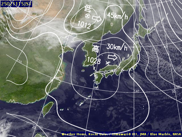 | 地上(高知大学気象情報頁赤外画像と気象庁速報天気図を合成) | |||