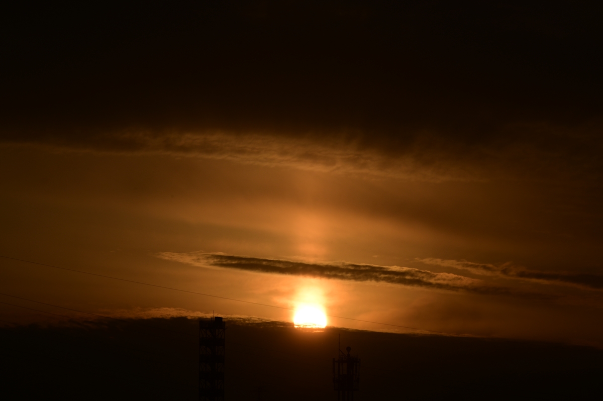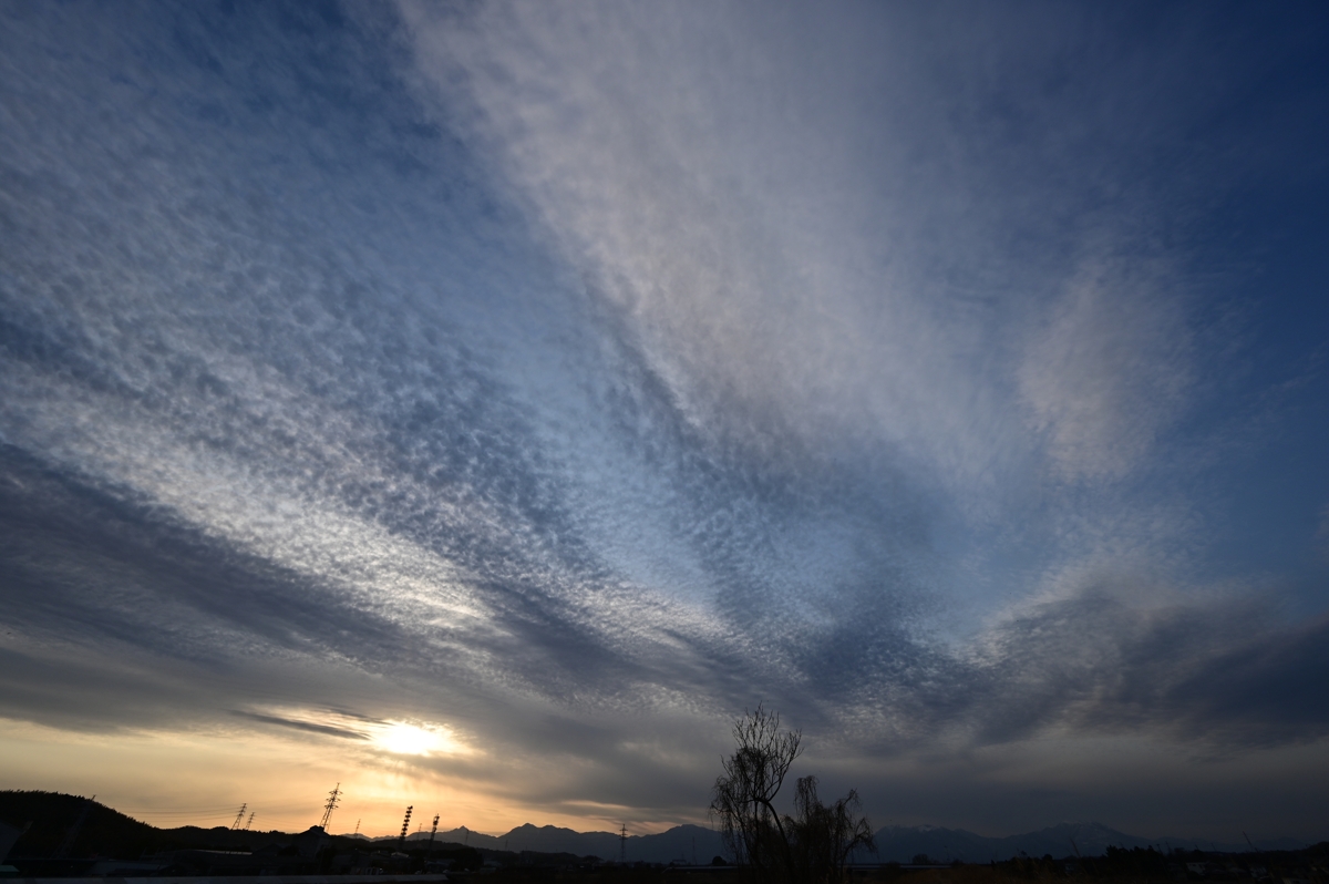 南に高気圧、北に低気圧があって午前は快晴。 下層の風は南寄りながら、中上層では西風。 昼過ぎにレンズ雲が生じ始めたあと、美しい 巻積雲とその波状雲が空を覆いました。 巻積雲がじきに消えてもレンズ雲がたくさん残り やがて西の鈴鹿山脈の山麓から湧き出すように 高積雲が生じて広がりました。夕方は高積雲と 巻積雲が重なっているような空でした。 さらに、日没のころ、太陽柱。大気中の氷晶に よる光の反射で生じる現象です。 |