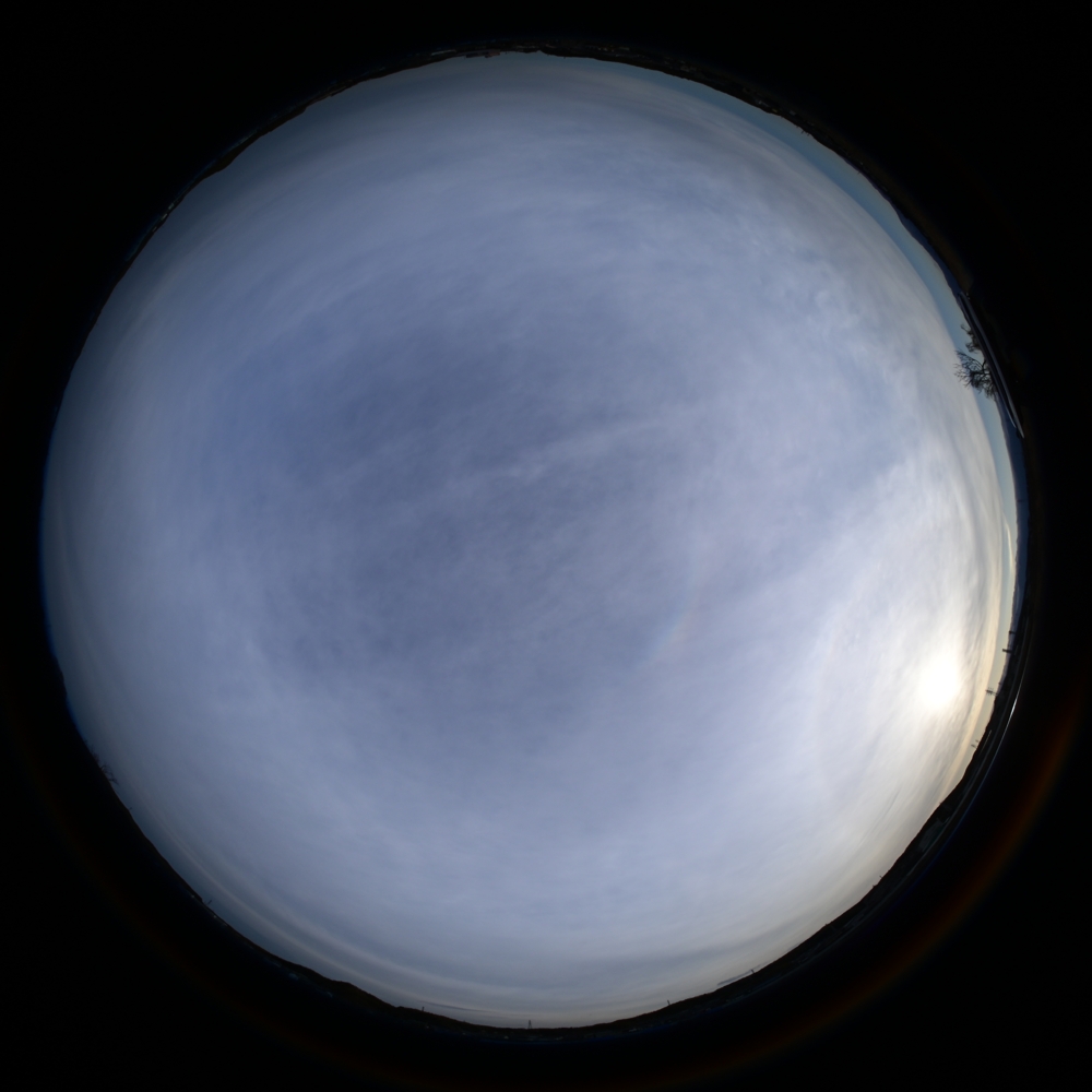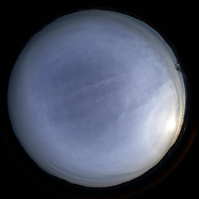 ハロ 環天頂アーク 16:20 上が北 全周魚眼 環天頂アークの曲率中心は天頂 |