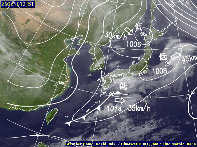 | 地上(高知大学気象情報頁赤外画像と気象庁速報天気図を合成) | |||