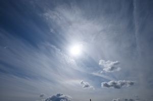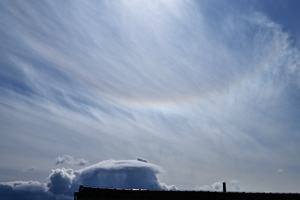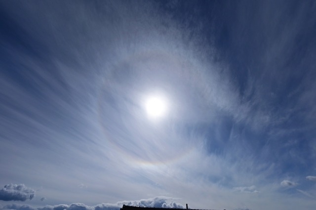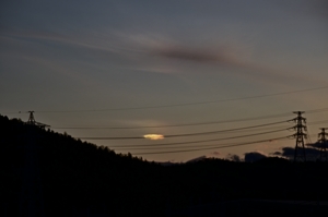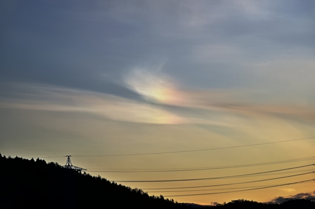 | 西高東低気圧配置が緩んでいて下層にはレンズ雲が多数。 そして、南の低圧部に起因する上層雲が上空を覆いました。 昼頃は22°ハロやタンジェントアークが継続し、日没近く なると、淡いながらも美しい幻日が見られました。 夕方、北北西のレンズ雲が持続し始め、日没後まで継続。 昨日も同じ場所に同様の雲が見られています。 |