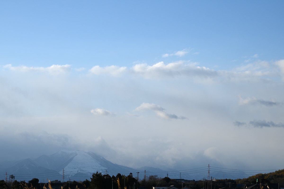 冬型気圧配置は緩んでいて、昨日、今日と 日差しには暖かさも感じられます。それでも 地上に雪は落とさずとも、少し上空には雪 の降水をもたらしている雲がときおり広が りました。鈴鹿山脈のようすを見ても、標高 の高い場所は濃い雪雲で、山麓は薄い雲。 平野部では地上まで降水はほとんど達して いないようでした。 |