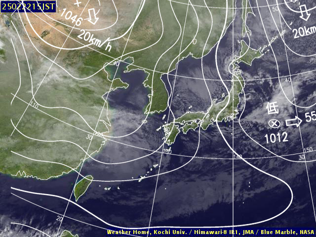 | 地上(高知大学気象情報頁赤外画像と気象庁速報天気図を合成) | |||