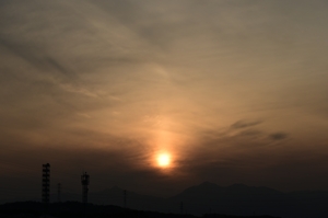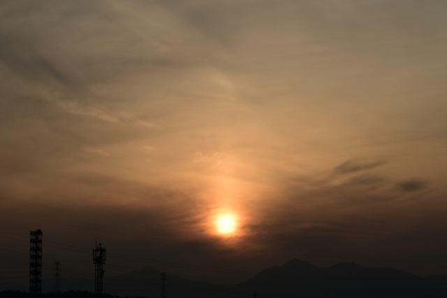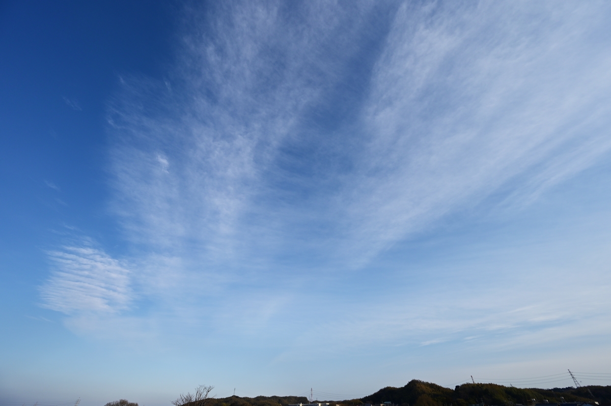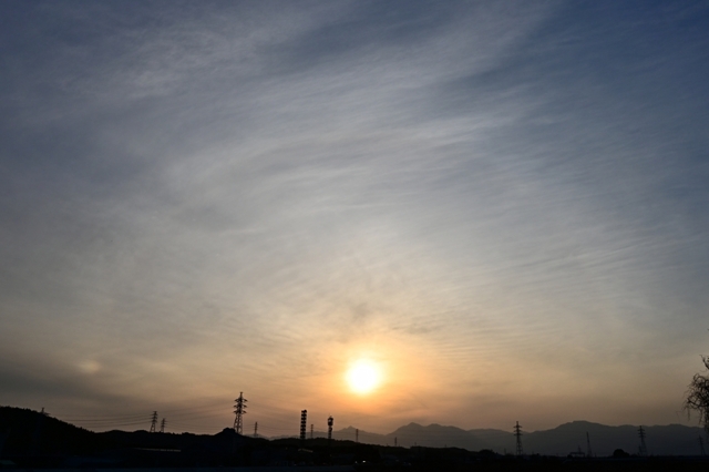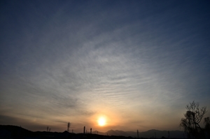 | 夕方になるまで快晴の空、最高気温(桑名)は15.2℃と 春を思わせる陽気。 夕方になって、西から巻層雲が広がり、幻日、ハロ、 タンジェントアーク。また、波状雲、二重雲、尾流雲 などの特徴ある上層の雲もあらわれ、日没のころ には太陽柱も見られました。 |