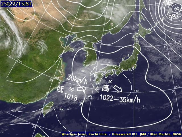 | 地上(高知大学気象情報頁赤外画像と気象庁速報天気図を合成) | |||