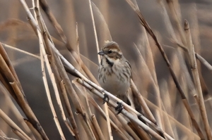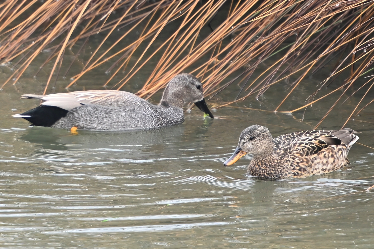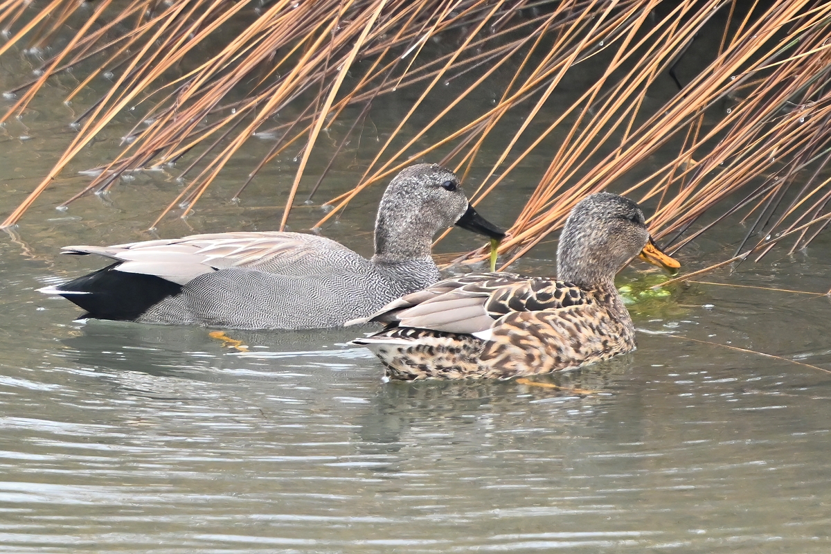 夕方の員弁川。雨で水位が上昇。 10羽ほどのカルガモが水位の上がった手前岸にたむろ。 2羽だけが群れから離れて別行動っぽくいるので、近くに 来たところを観察すると、オカヨシガモでした。 オカヨシガモはオスとメスがよく並んでいるようです。 中州には冬羽のオオジュリン。 カワセミは水位のせいか、照れる場所には留まらず。 |