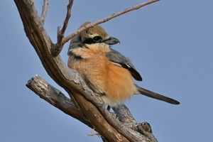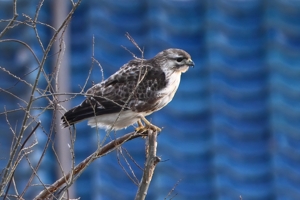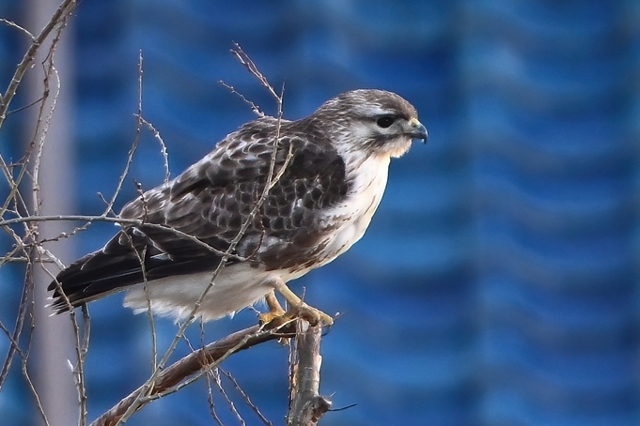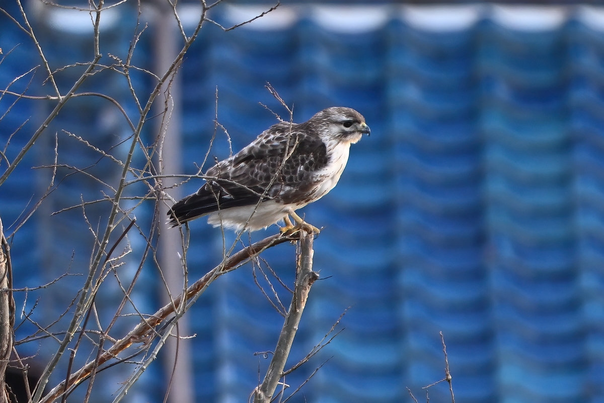日没前に対岸の樹木に留まった(たぶん)ノスリを