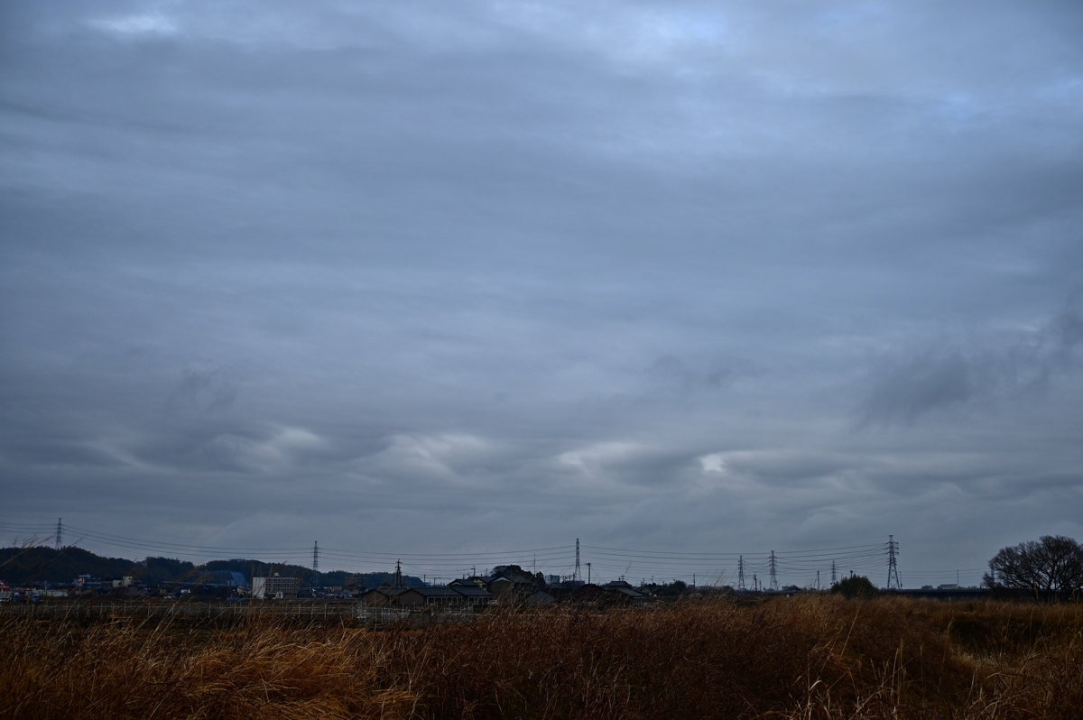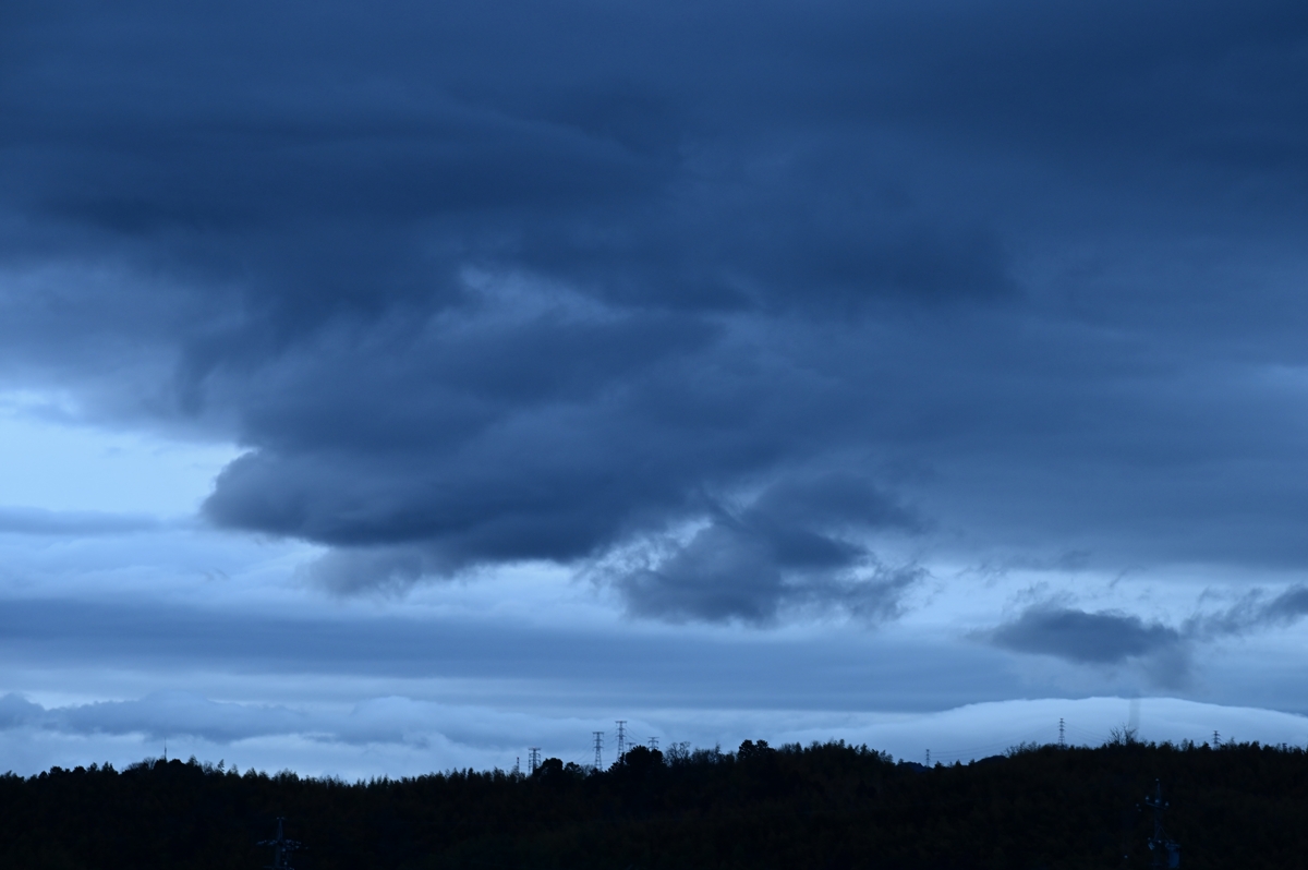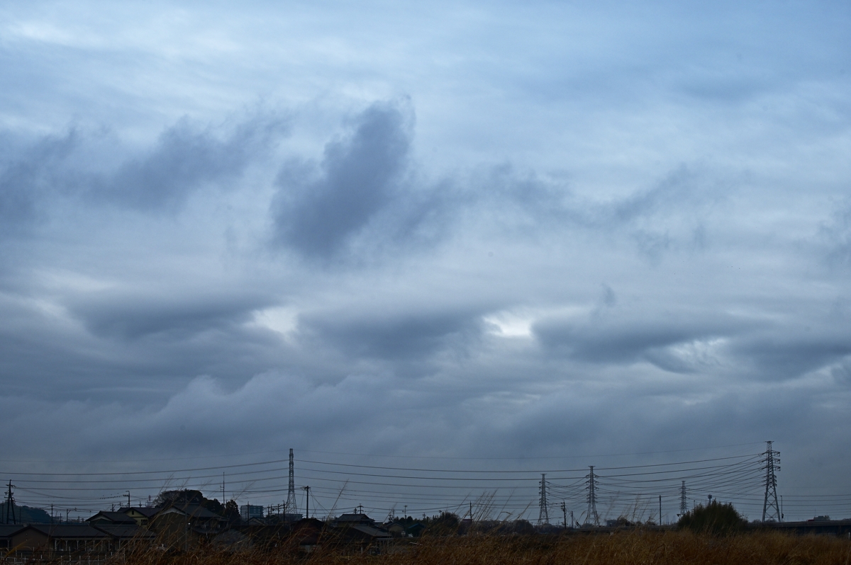 低気圧は関東地方に雪を降らせて東に去りましたが、 前線はなかなか離れず、今日も三重県北部は雨で、 雨が上がってからもゆっくりと雲が消えて、雲底に バラエティに富んだ形状の雲が多く生まれました。 最も目をひいたのは、南東へ流れ続ける波動性を 持った雲。広く残った層積雲の雲底の一部に長い 時間にわたって生じていました。 |