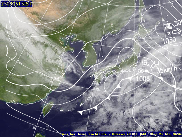 | 地上(高知大学気象情報頁赤外画像と気象庁速報天気図を合成) | |||