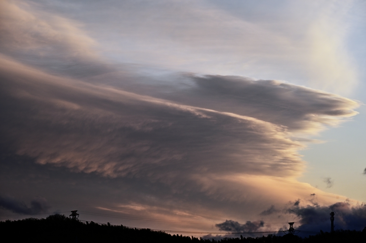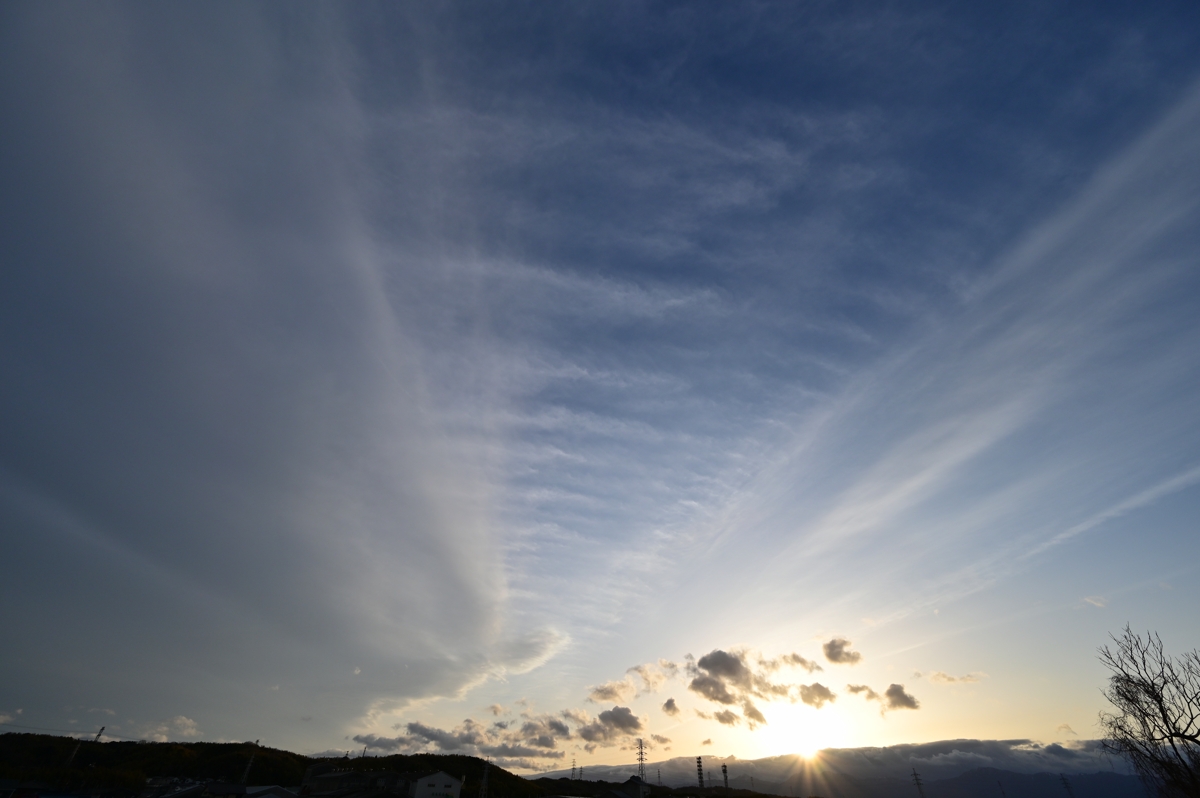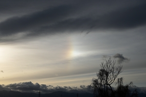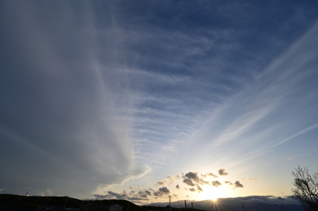昼頃、巻層雲に22°ハロ。 レンズ雲が生まれ始めて、昼過ぎから夕方にかけて、 山脈沿いに連なる、美しい造形のつるし雲が発生。 つるし雲からはこれに続くように高層雲が発生。 上層には巻層雲もあって、タンジェントアークやハロ。 夕方には、とても明るい幻日もあらわれました。 そして日没前、山麓のつるし雲から続く雲の雲底に 乳房雲。めずらしい場所に生じた乳房雲だと思います。 |