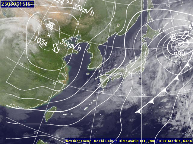 | 地上(高知大学気象情報頁赤外画像と気象庁速報天気図を合成) | |||