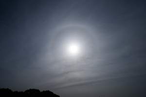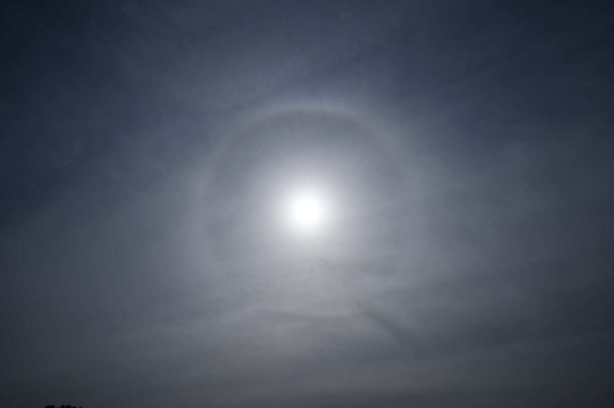 南岸の停滞前線に伴う雲域の北縁にある巻層雲が 午前中に通過。22°ハロがあらわれ、ときどき タンジェントアークの重なりの光が強まりました。 ハロは天気が下り坂になる前兆とよく言われますが、 今日の場合は午後になると、雲域の北縁が南に移って みごとな快晴の空になり、気温(桑名)も19.8℃にまで 上昇、風は冷たくも暖かい春の日になりました。 |