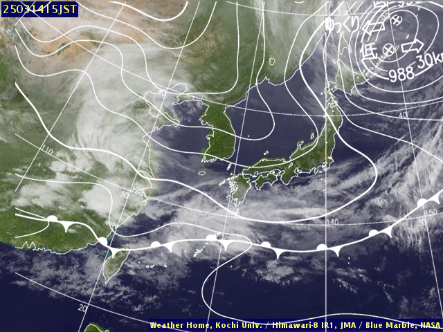 | 地上(高知大学気象情報頁赤外画像と気象庁速報天気図を合成) | |||
