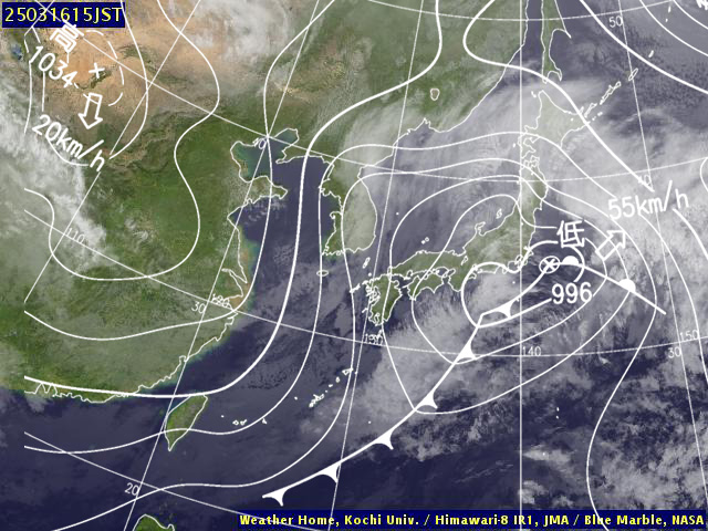 | 地上(高知大学気象情報頁赤外画像と気象庁速報天気図を合成) | |||
