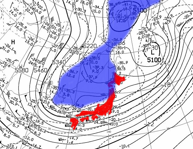 | 気象庁高層天気図 500hPa 09時 日本海を覆いつくす寒気域 |