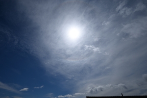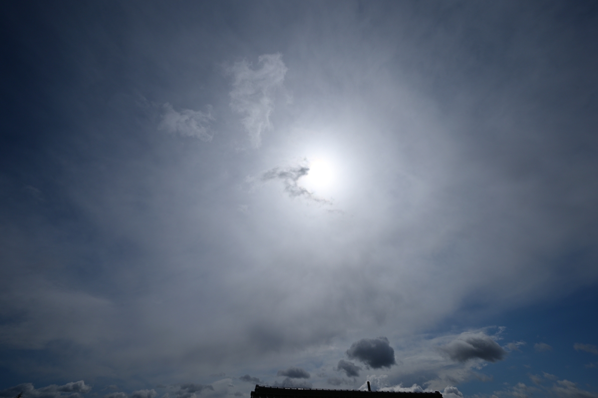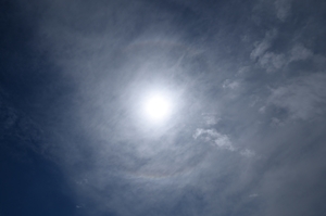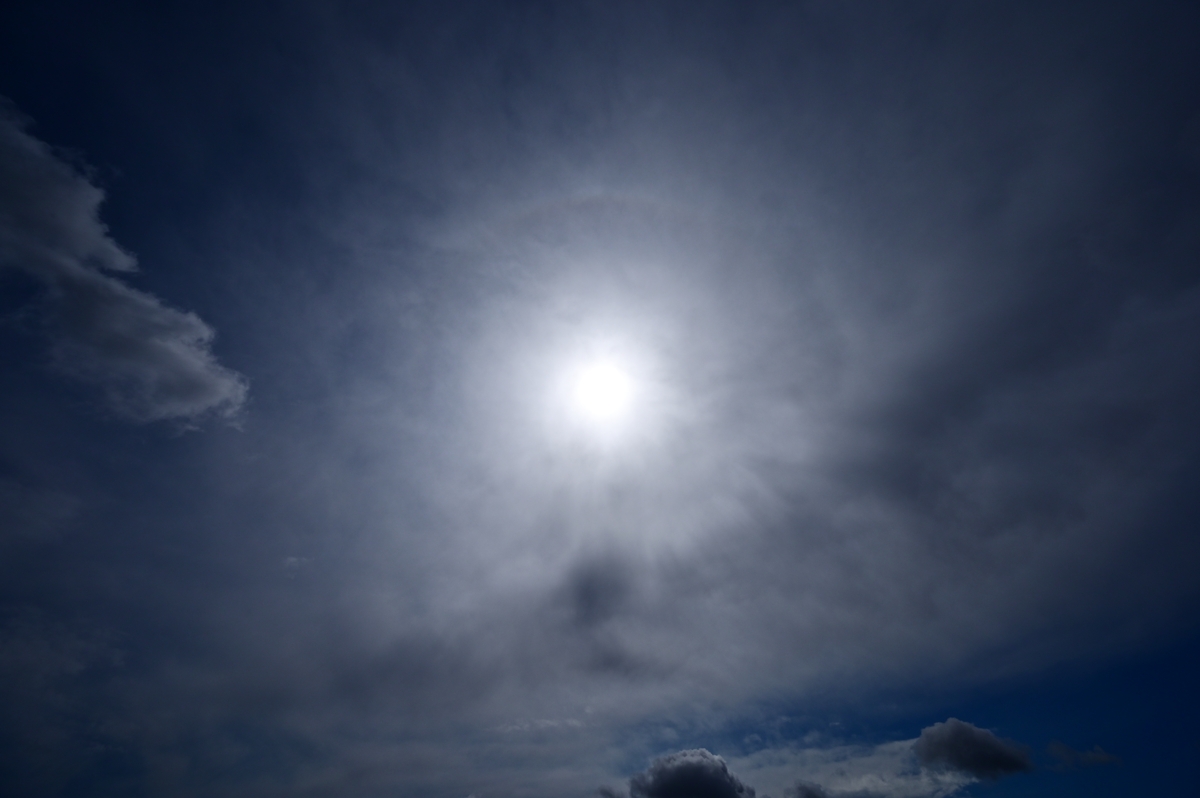 | タンジェントアーク・22°ハロ 13:09 14mm 明らかに雲は巻層雲ではなく、 降水の尾流を伴う低い雲。 あえて分類すれば高層雲。 |