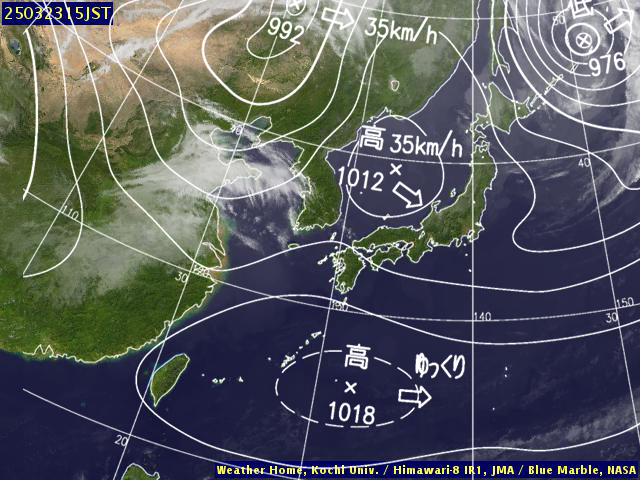 | 地上(高知大学気象情報頁赤外画像と気象庁速報天気図を合成) | |||