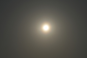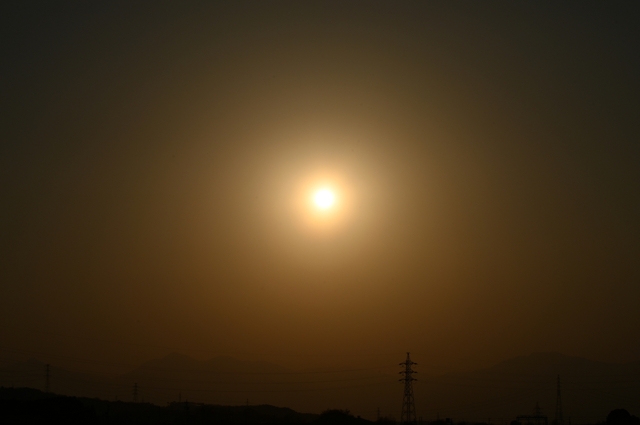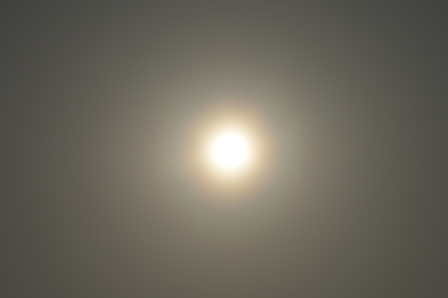 3日間つづけて快晴、最高気温は24.3℃と夏日寸前の暖かさ。 春霞の空に浮かぶ太陽は、夕方になると今日も淡い花粉光環。 (肉眼では不明瞭) くしゃみを連発しながら撮影しましたが、 そのわりには鮮やかさに欠ける淡い光環でした。 |