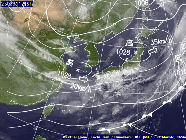 | 地上(高知大学気象情報頁赤外画像と気象庁速報天気図を合成) | |||