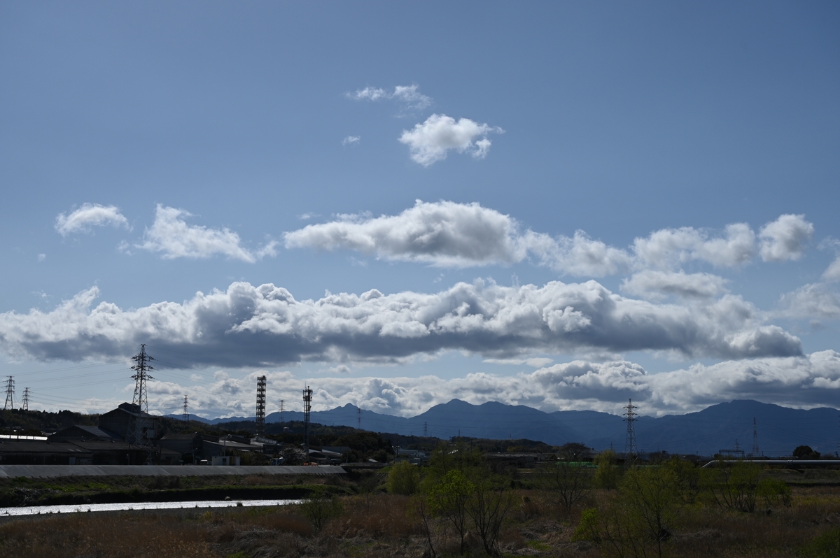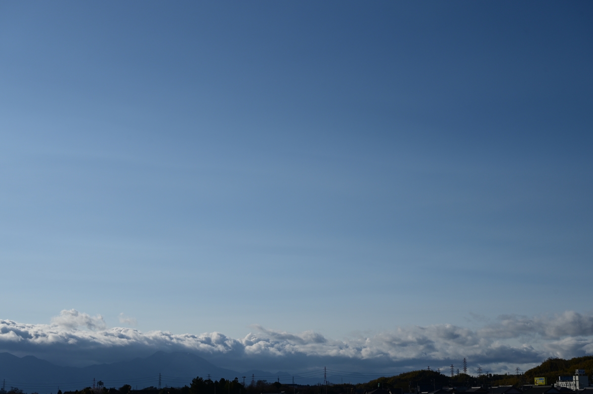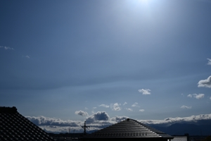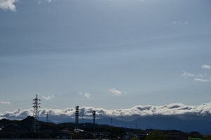 | 上空に寒気を伴った低気圧により、北日本では荒天の所も。 三重県北部も突風気味の強い風が吹きました。 鈴鹿山脈の風下、いつもは細長いつるし雲ができるような 場所に、雲といえるかどうかの薄い層雲が発生しました。 山脈に沿っており、山脈を越えた気流の鉛直波動で 生じているように思われます。 |