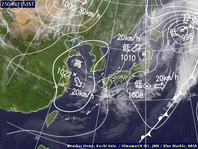 | 地上(高知大学気象情報頁赤外画像と気象庁速報天気図を合成) | |||