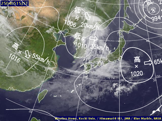 | 地上(高知大学気象情報頁赤外画像と気象庁速報天気図を合成) | |||