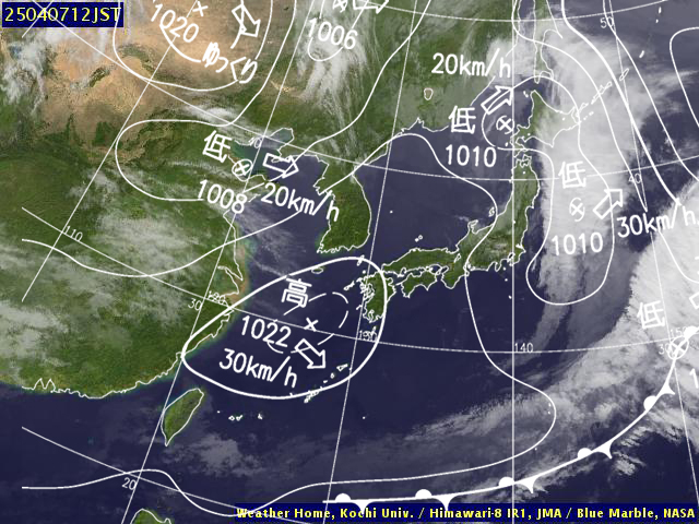| 地上(高知大学気象情報頁赤外画像と気象庁速報天気図を合成) | |||