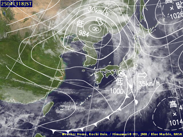 | 地上(高知大学気象情報頁赤外画像と気象庁速報天気図を合成) 北緯43°の低気圧は顕著な寒冷渦。紀伊半島を通過した低気圧も 前線を伴う温帯低気圧ながら、前線が閉塞しはじめて上空寒気の状態。 |