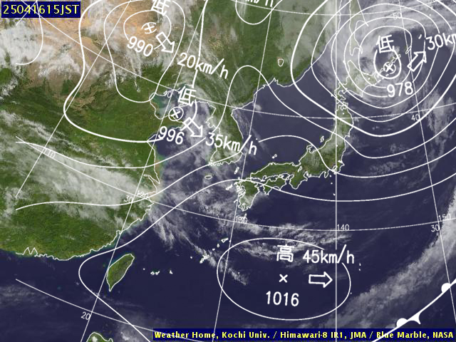 | 地上(高知大学気象情報頁赤外画像と気象庁速報天気図を合成) | |||